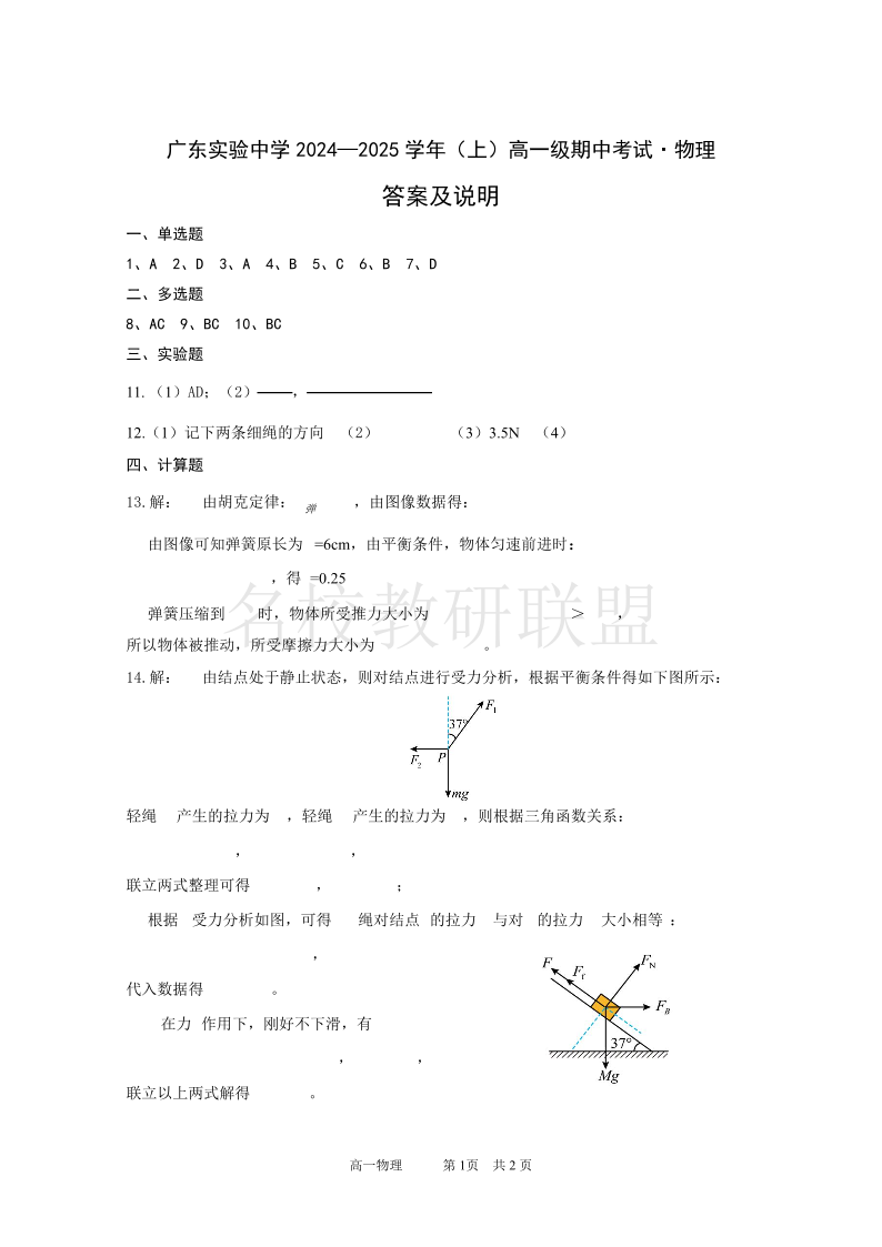 广东实验中学2024-2025 学年(上)高一级期中考试 物理答案