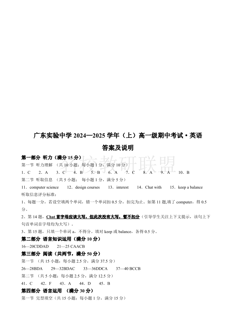 广东实验中学2024-2025 学年(上)高一级期中考试 英语答案