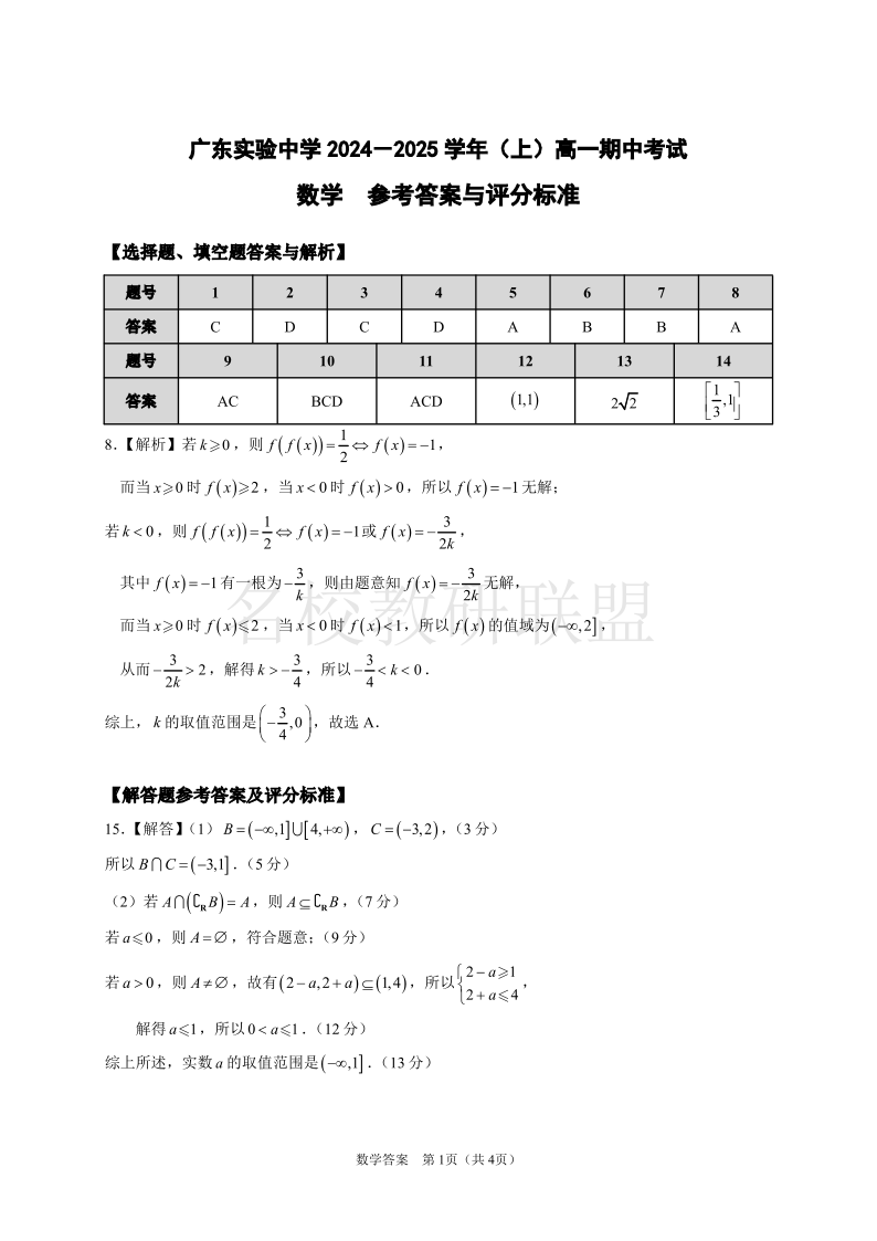 广东实验中学2024-2025 学年(上)高一级期中考试 数学答案