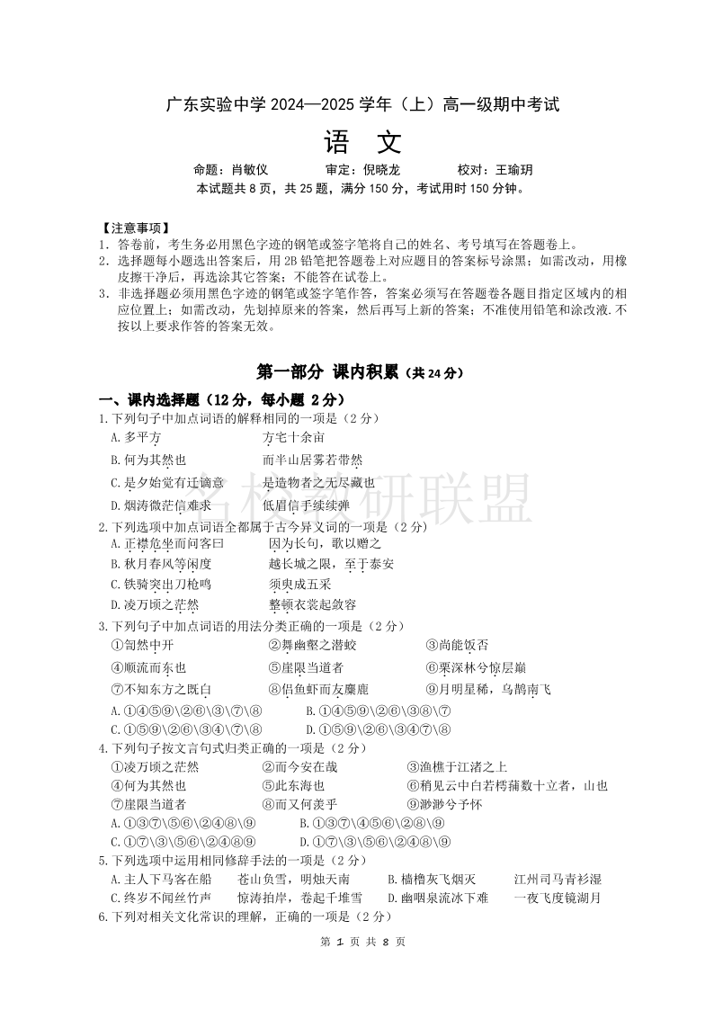 广东实验中学2024-2025 学年(上)高一级期中考试 语文