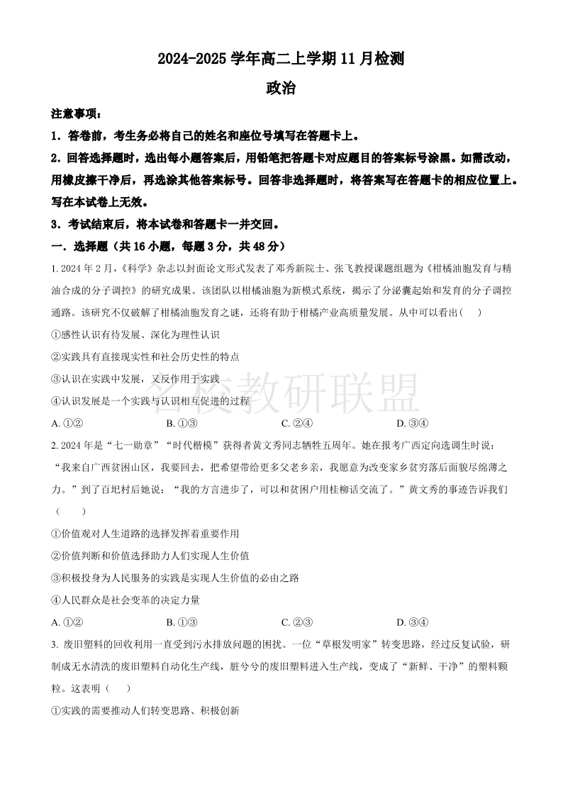 河南省安阳市林州市第一中学2024-2025学年高二上学期11月检测 政治