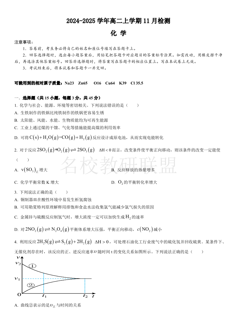 河南省安阳市林州市第一中学2024-2025学年高二上学期11月检测 化学