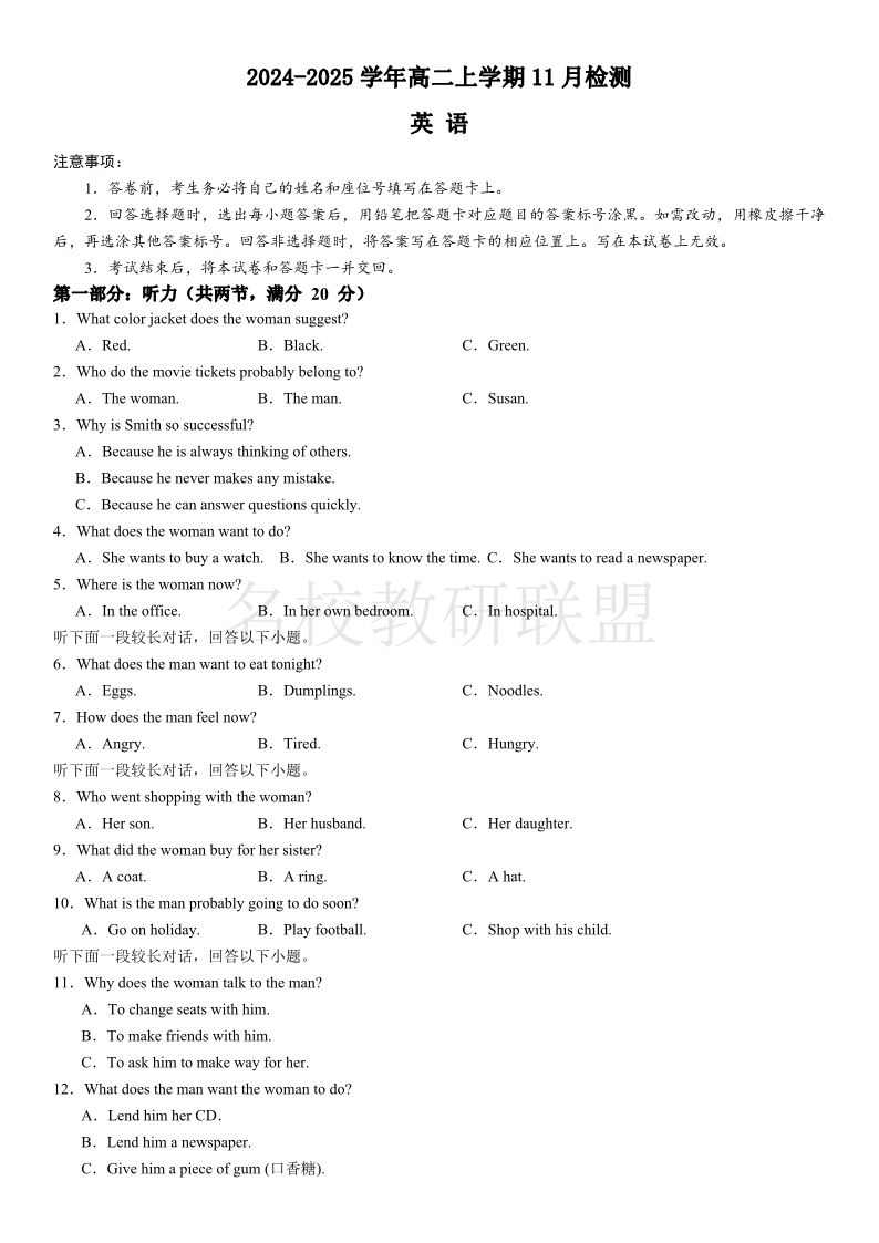 河南省安阳市林州市第一中学2024-2025学年高二上学期11月检测 英语