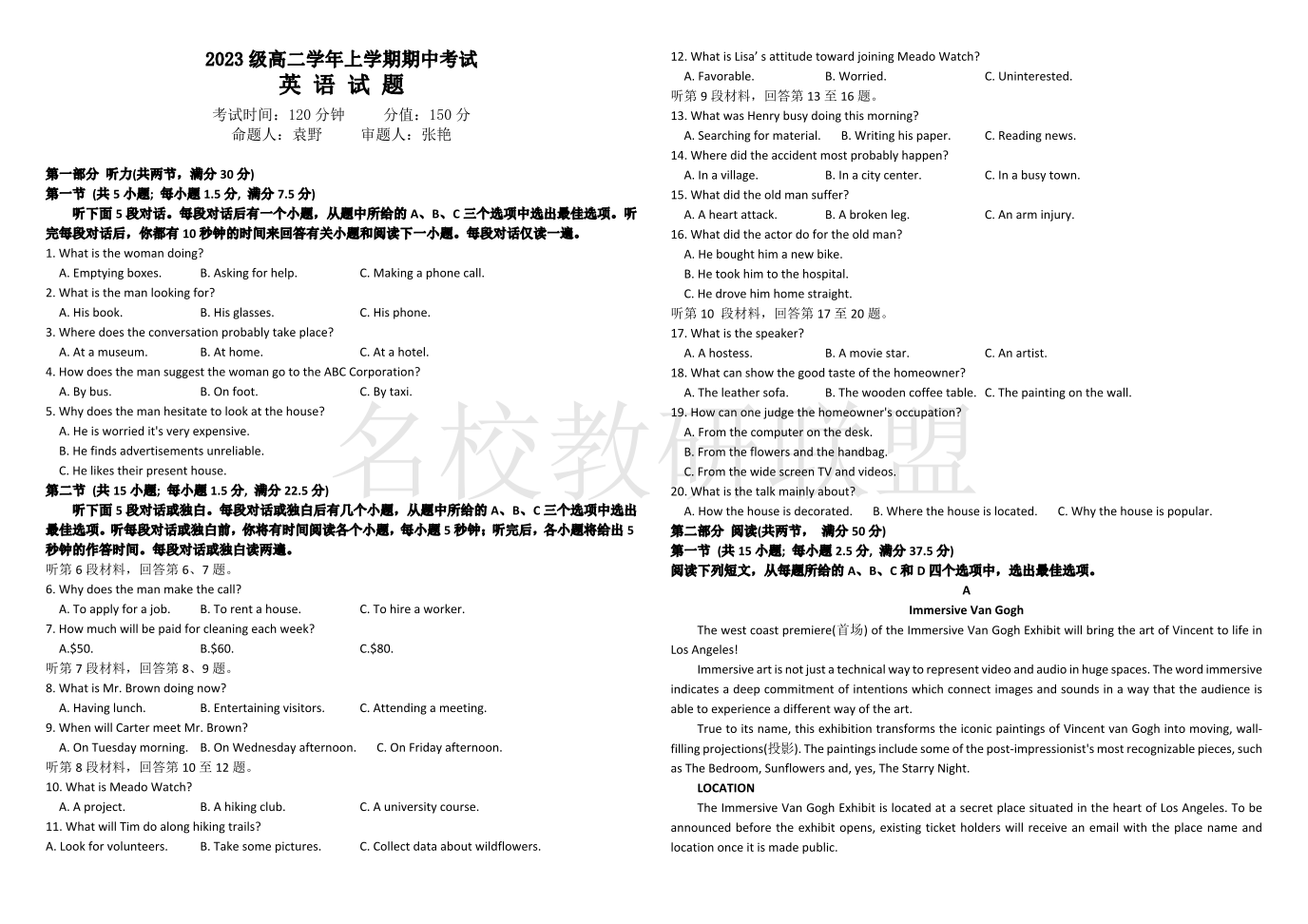 黑龙江省牡丹江市第一高级中学2024-2025学年高二上学期11月期中考试 英语