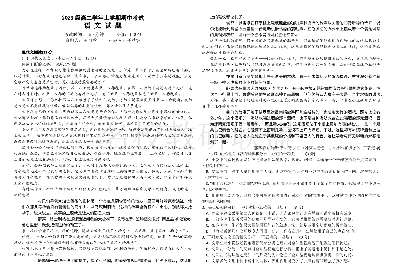 黑龙江省牡丹江市第一高级中学2024-2025学年高二上学期11月期中考试 语文