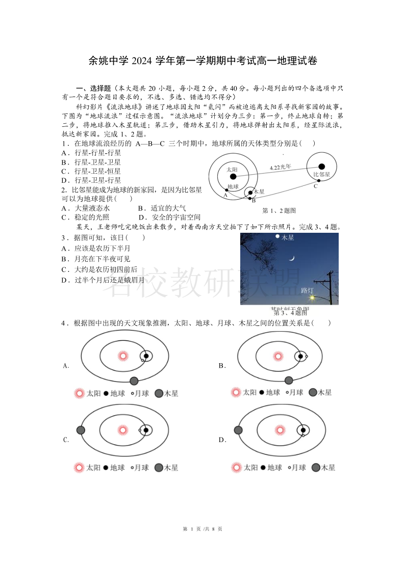 余姚中学2024学年第一学期高一期中考试 地理