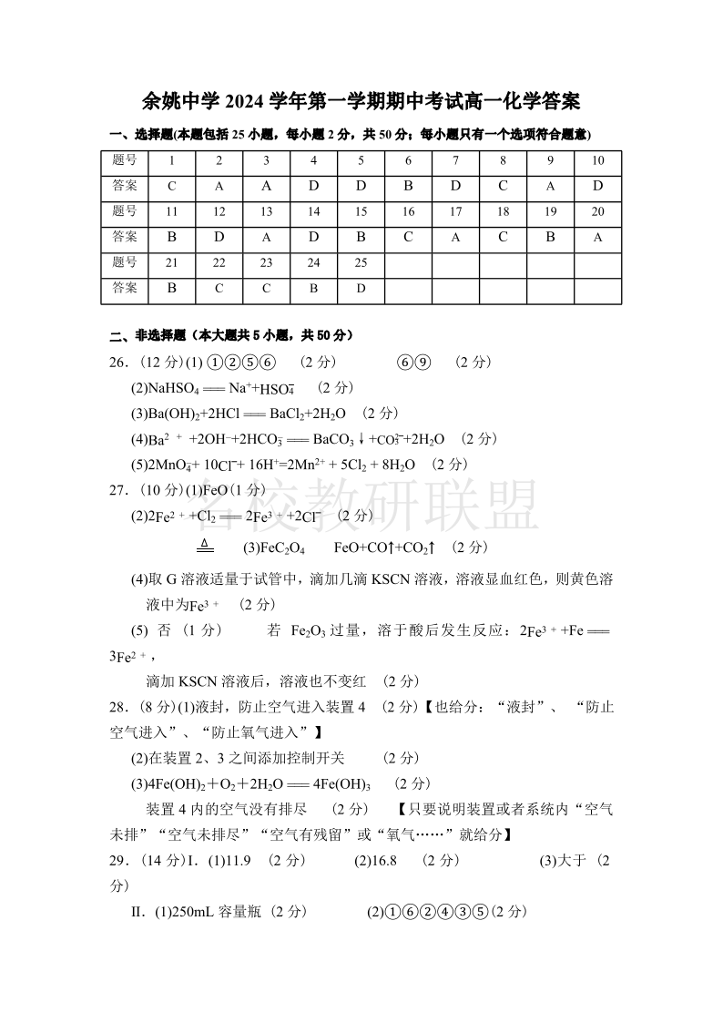 余姚中学2024学年第一学期高一期中考试 化学答案