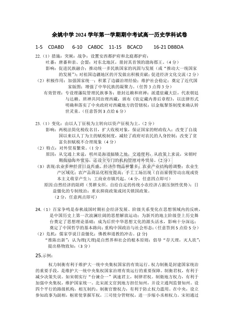 余姚中学2024学年第一学期高一期中考试 历史答案