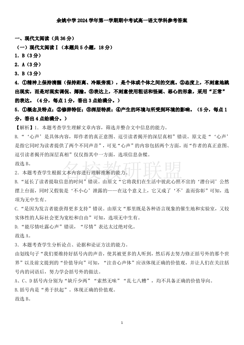 余姚中学2024学年第一学期高一期中考试 语文答案