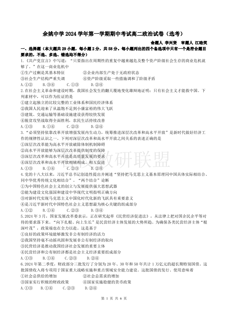 余姚中学2024学年第一学期高二期中考试 政治