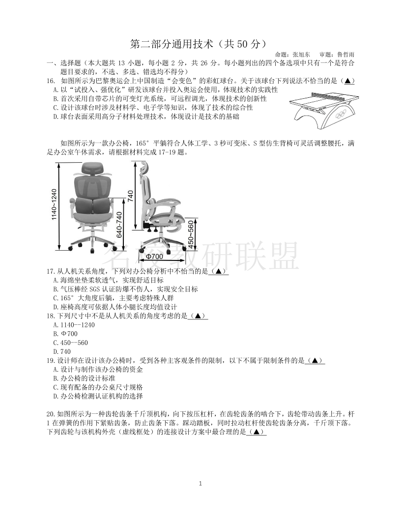 余姚中学2024学年第一学期高二期中考试 通用技术