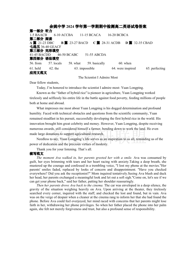 余姚中学2024学年第一学期高二期中考试 英语答案