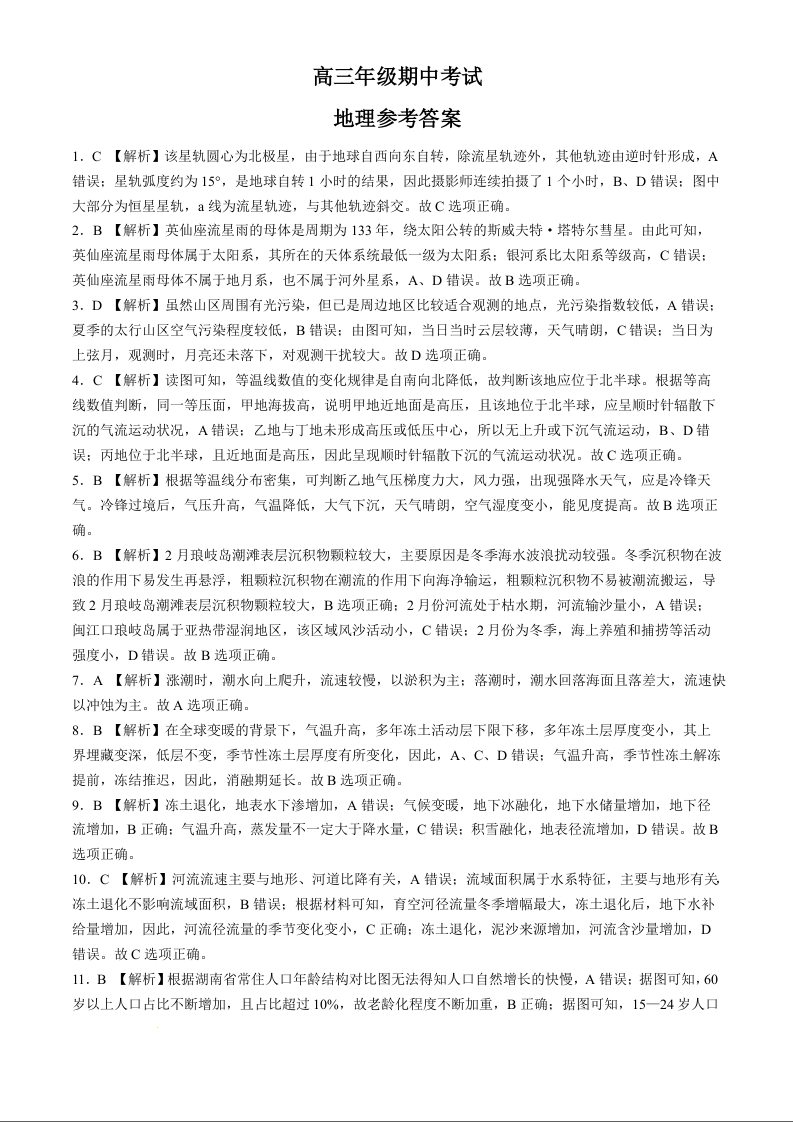 河北省秦皇岛市部分学校2024-2025学年高三上学期11月期中考试 地理答案