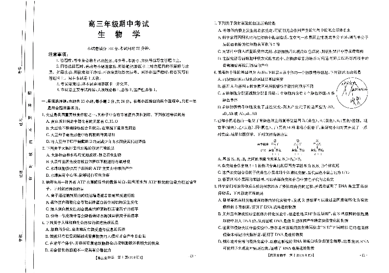 河北省秦皇岛市部分学校2024-2025学年高三上学期11月期中考试 生物