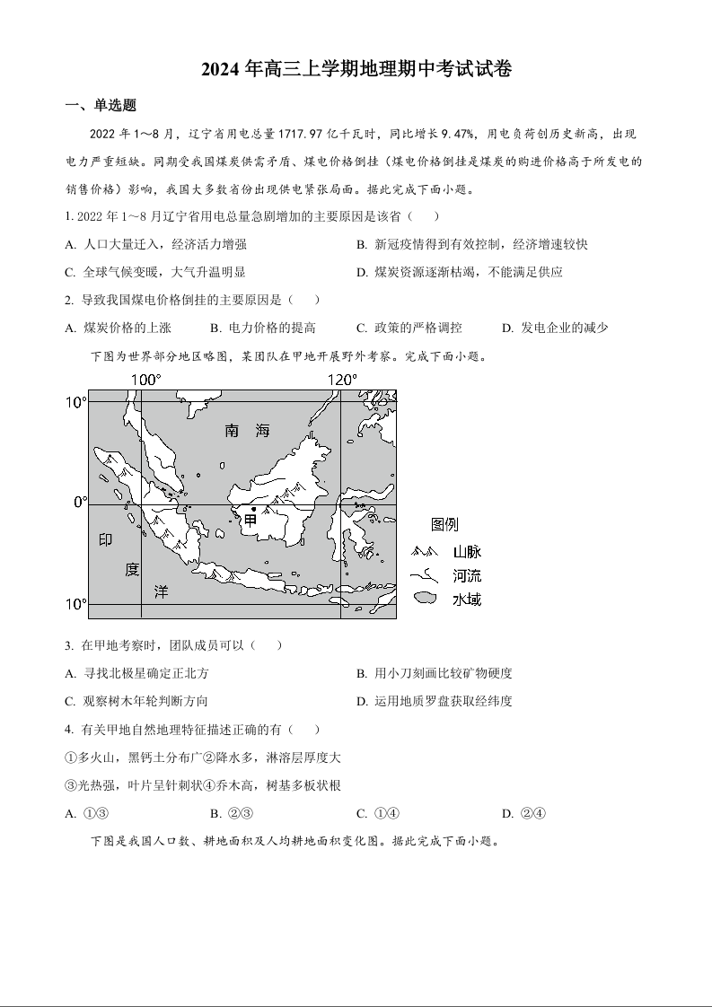 湖南省岳阳市临湘市2024年高三上学期期中考试 地理