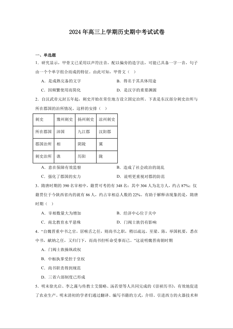 湖南省岳阳市临湘市2024年高三上学期期中考试 历史