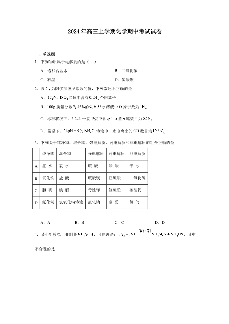 湖南省岳阳市临湘市2024年高三上学期期中考试 化学