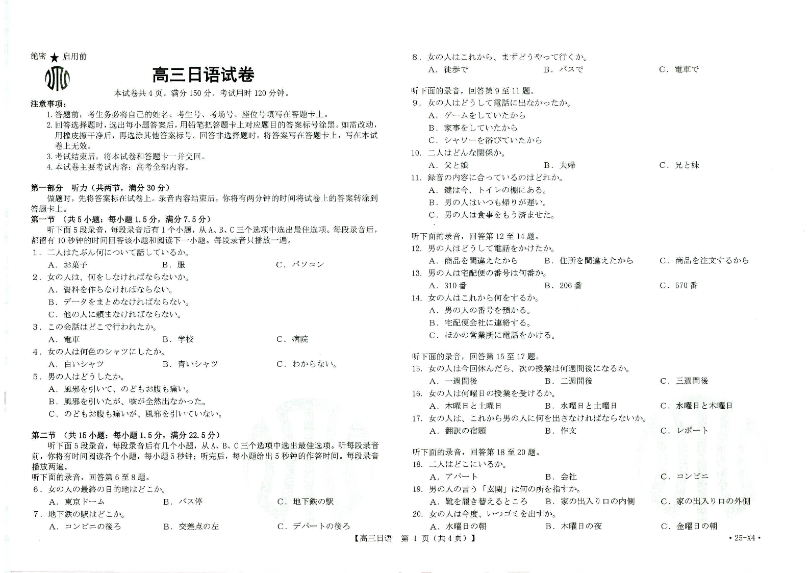 广西部分学校2025届高三11月大联考 日语