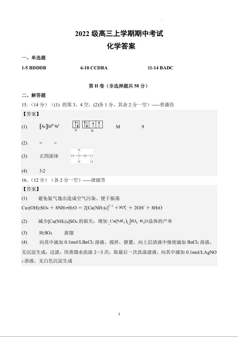 四川省仁寿第一中学校南校区2025届高三上学期11月期中考试 化学答案