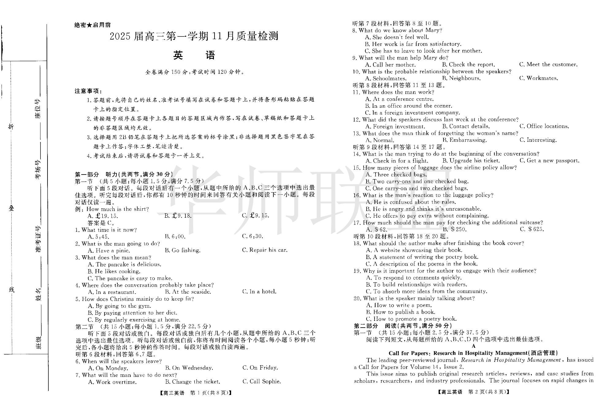 河南省华师联盟2025届高三第一学期11月质量检测 英语