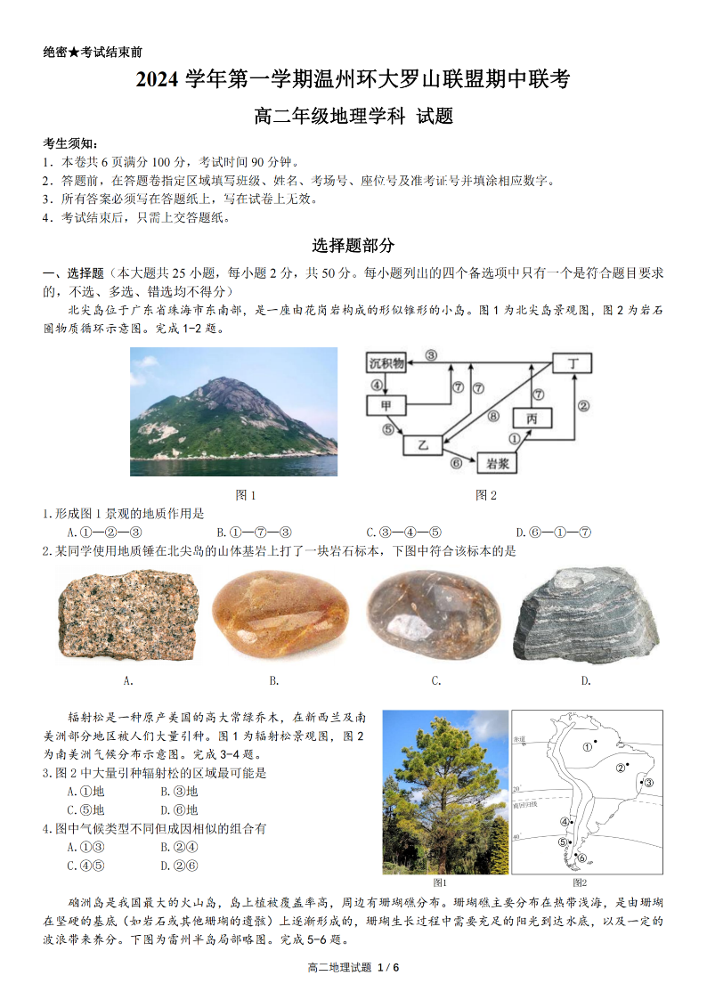 温州环大罗山联盟2024年高二第一学期期中联考 地理