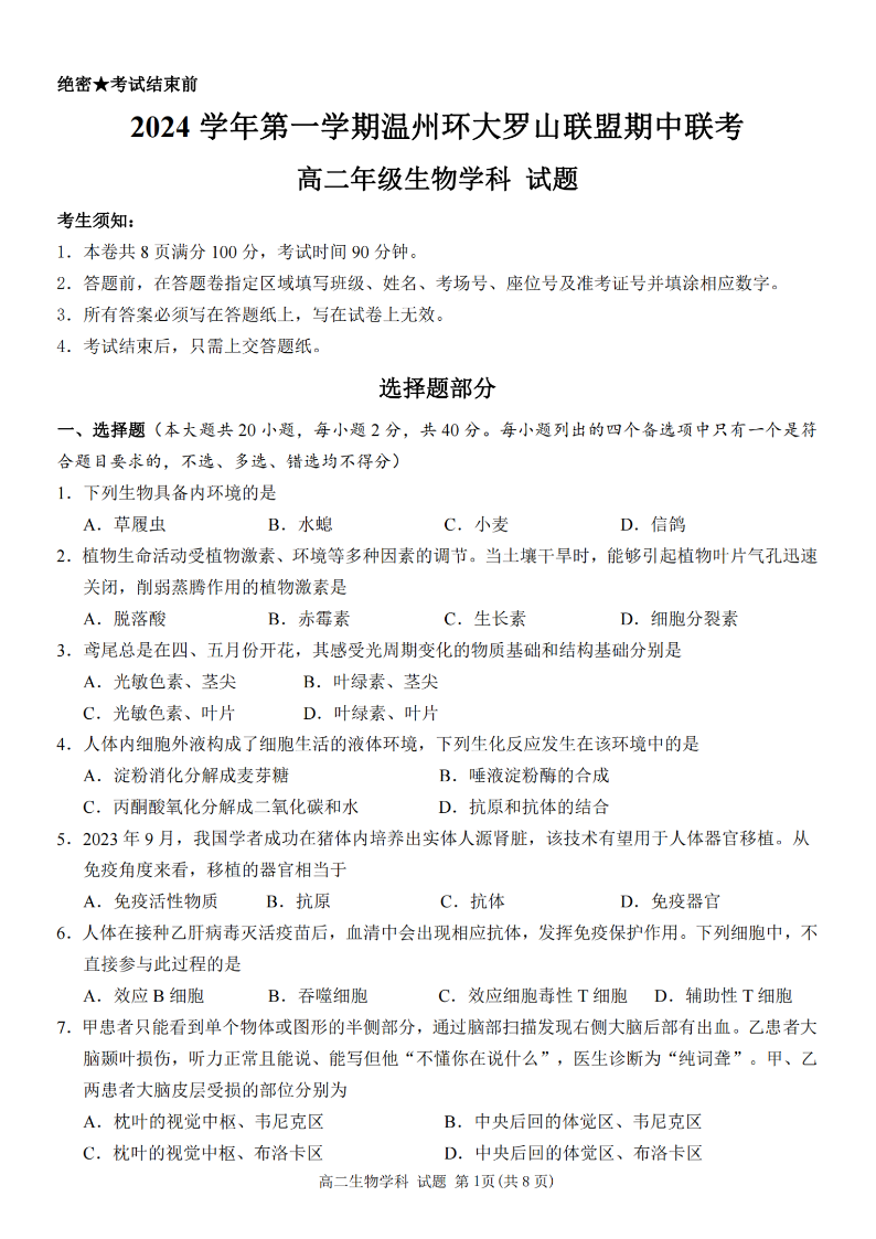 温州环大罗山联盟2024年高二第一学期期中联考 生物