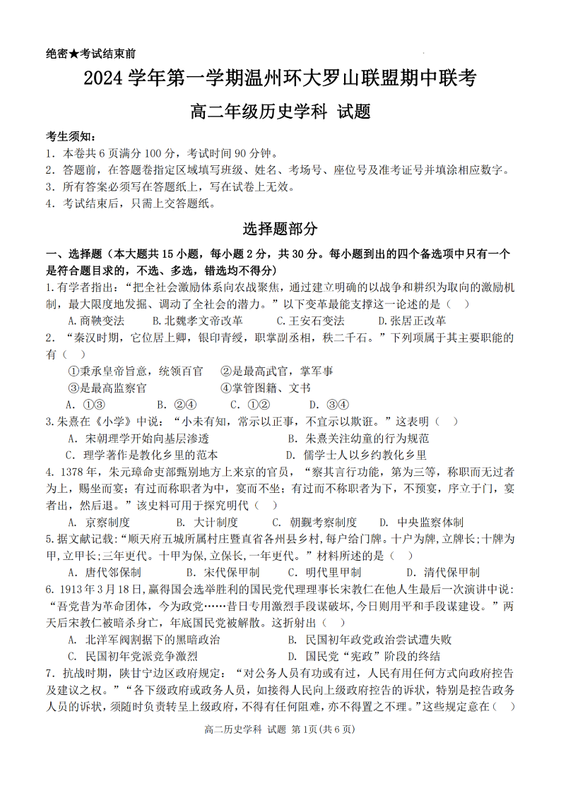 温州环大罗山联盟2024年高二第一学期期中联考 历史