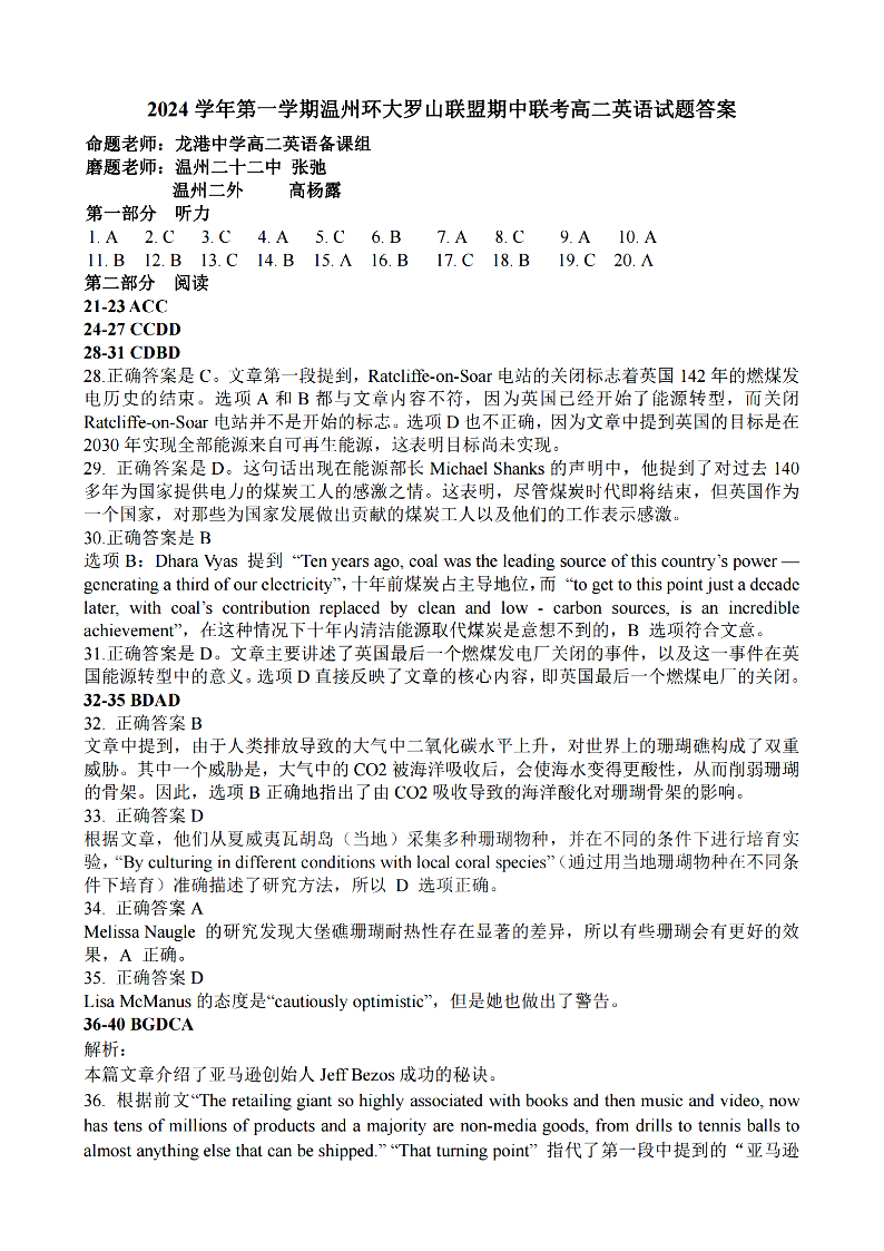 温州环大罗山联盟2024年高二第一学期期中联考 英语答案