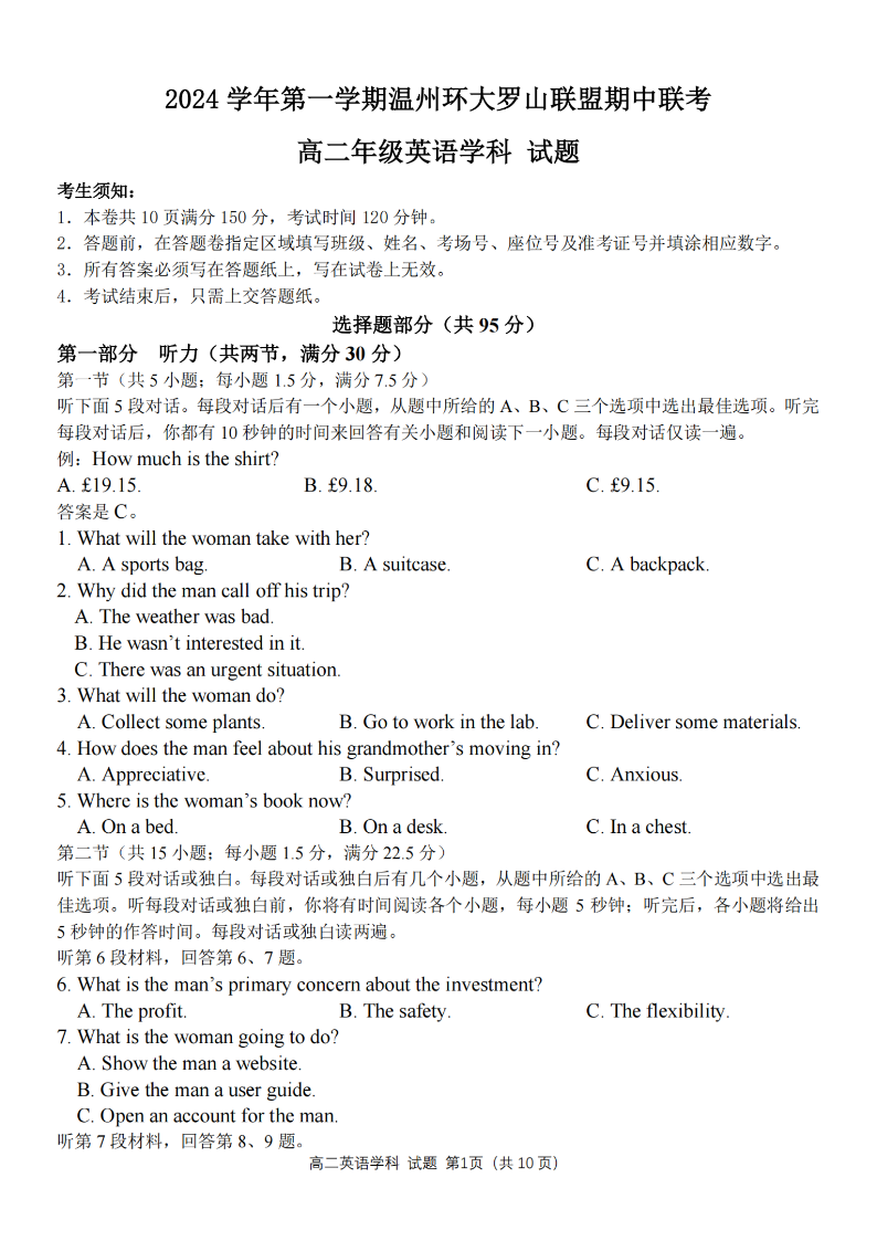 温州环大罗山联盟2024年高二第一学期期中联考 英语