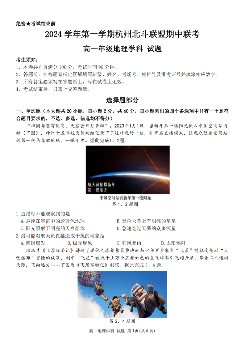 杭州北斗联盟2024学年高一第一学期期中联考 地理