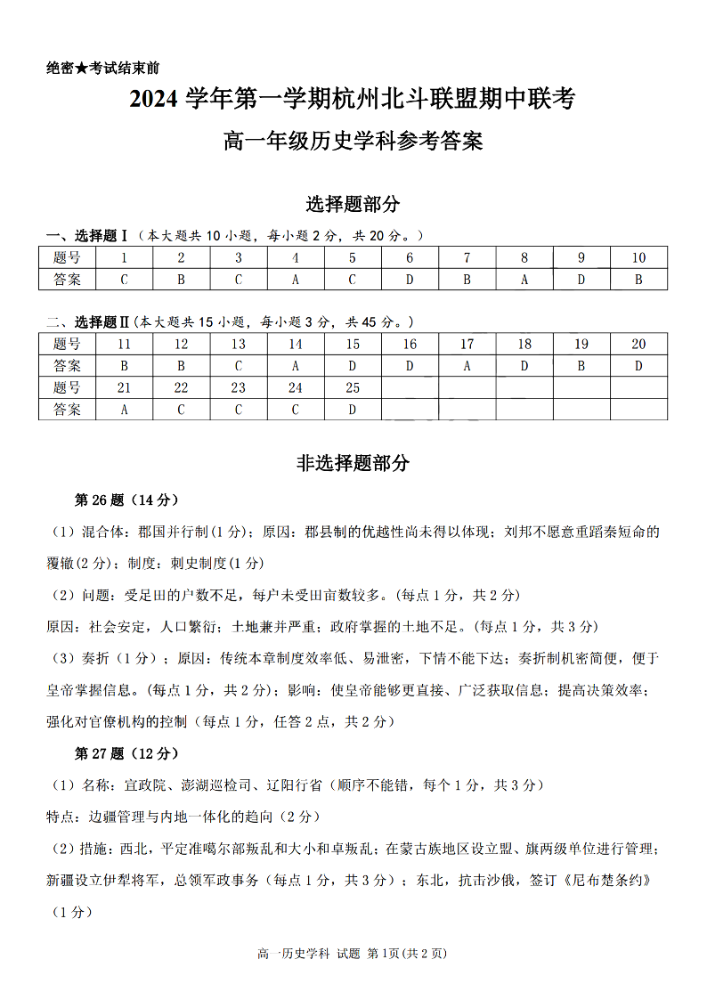杭州北斗联盟2024学年高一第一学期期中联考 历史答案