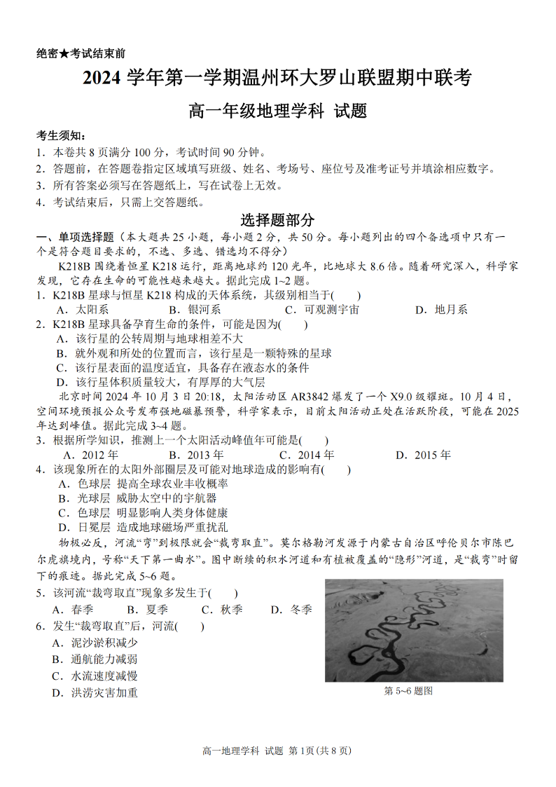 温州环大罗山联盟2024年高一第一学期期中联考 地理