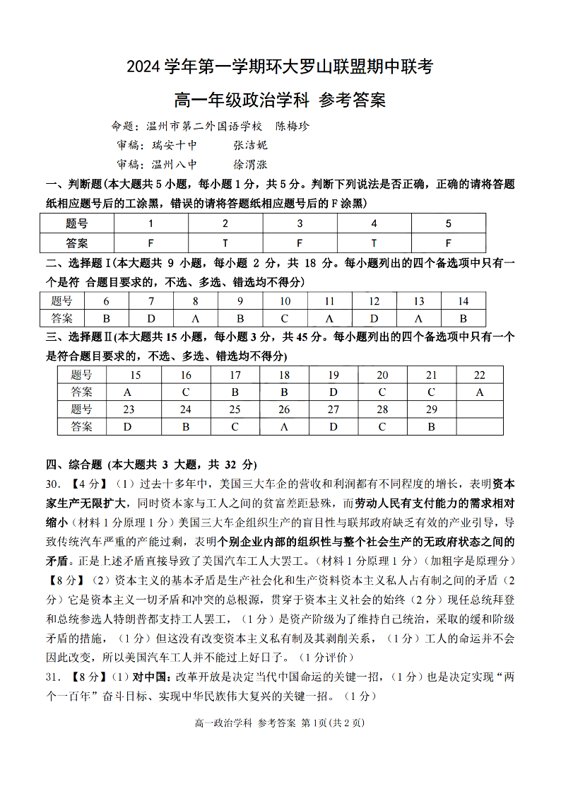 温州环大罗山联盟2024年高一第一学期期中联考 政治答案