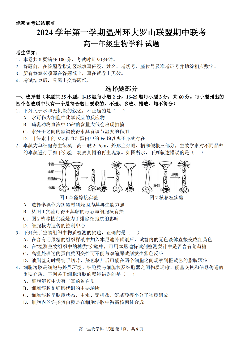 温州环大罗山联盟2024年高一第一学期期中联考 生物