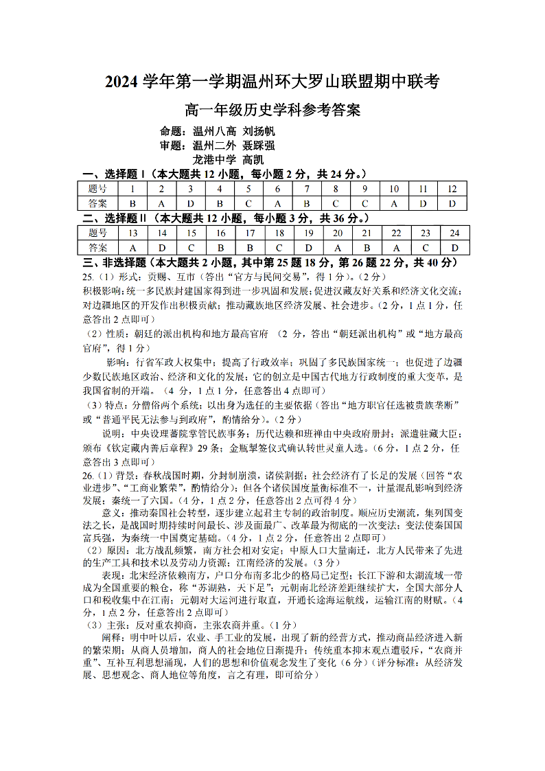 温州环大罗山联盟2024年高一第一学期期中联考 历史答案