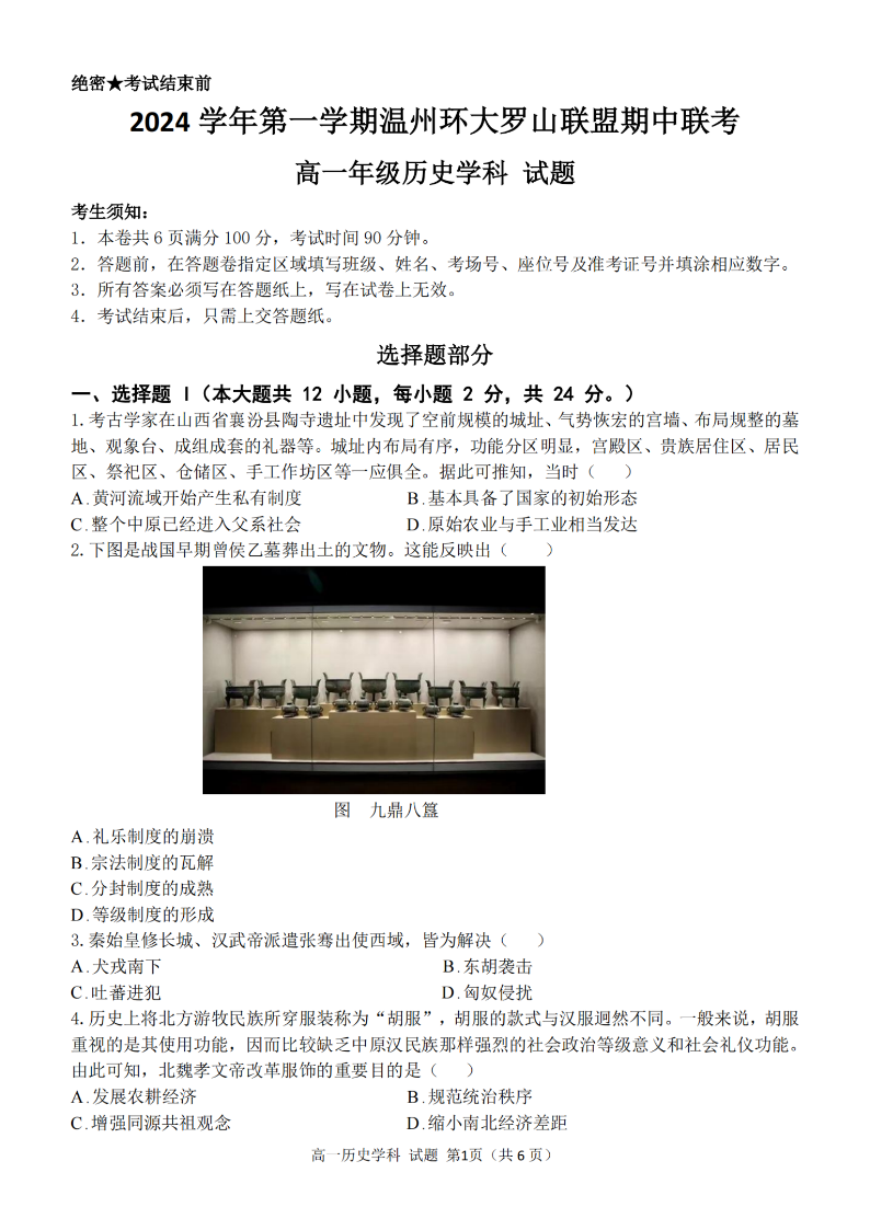 温州环大罗山联盟2024年高一第一学期期中联考 历史