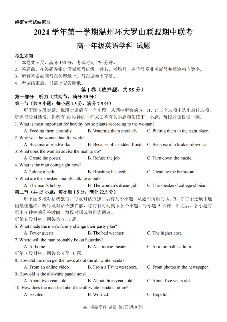 温州环大罗山联盟2024年高一第一学期期中联考 英语