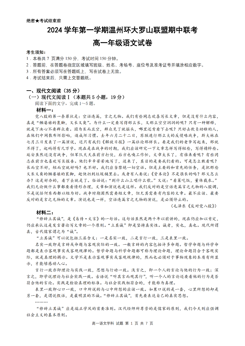 温州环大罗山联盟2024年高一第一学期期中联考 语文