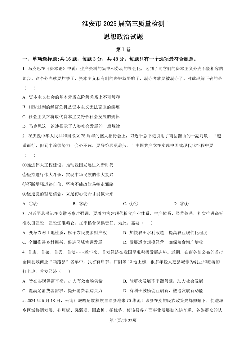 江苏省淮安市2025届高三上学期第一次调研测试 政治