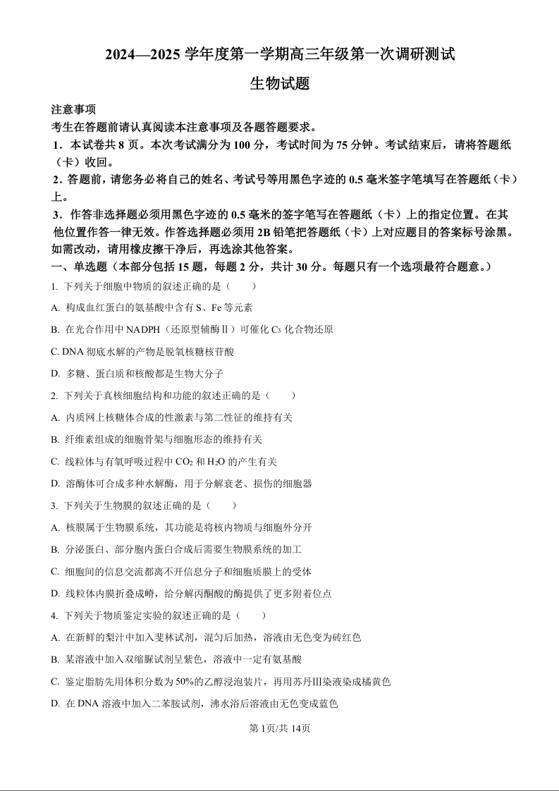 江苏省淮安市2025届高三上学期第一次调研测试 生物