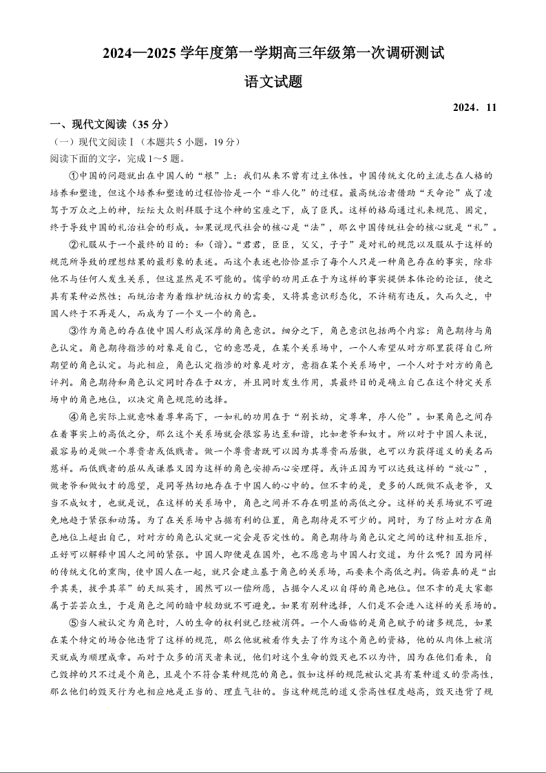 江苏省淮安市2025届高三上学期第一次调研测试 语文