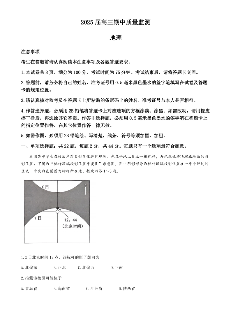江苏省南通市通州区、如东县2025届高三上学期11月期中联考 地理