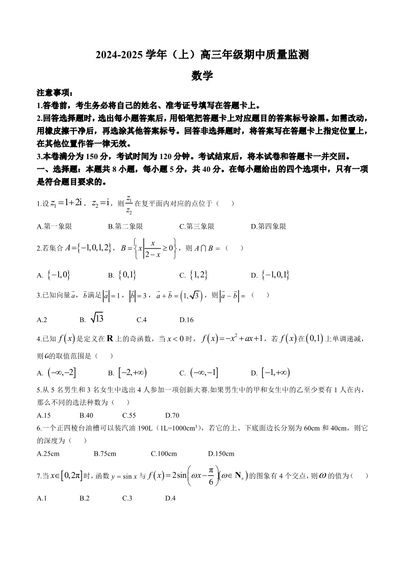 江苏省南通市通州区、如东县2025届高三上学期11月期中联考 数学