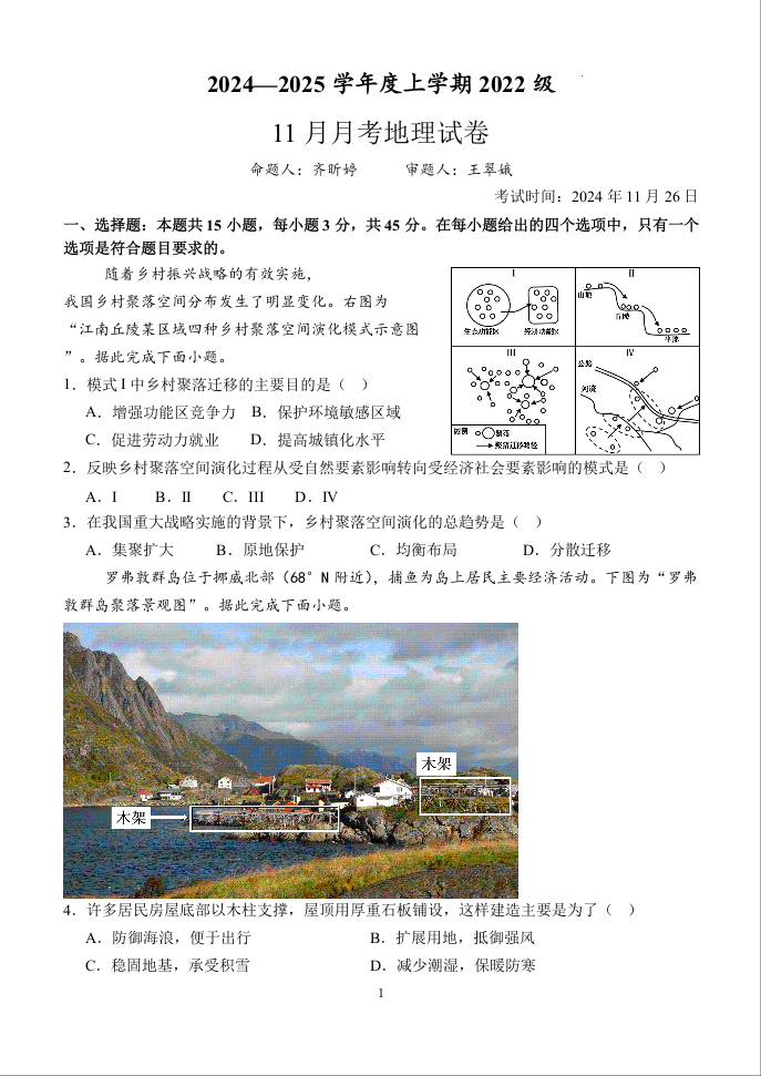湖北省荆州沙市中学2025届高三上学期11月月考 地理