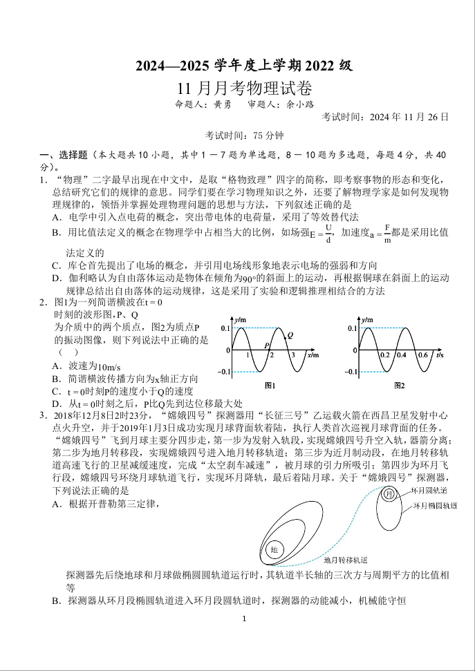 湖北省荆州沙市中学2025届高三上学期11月月考 物理