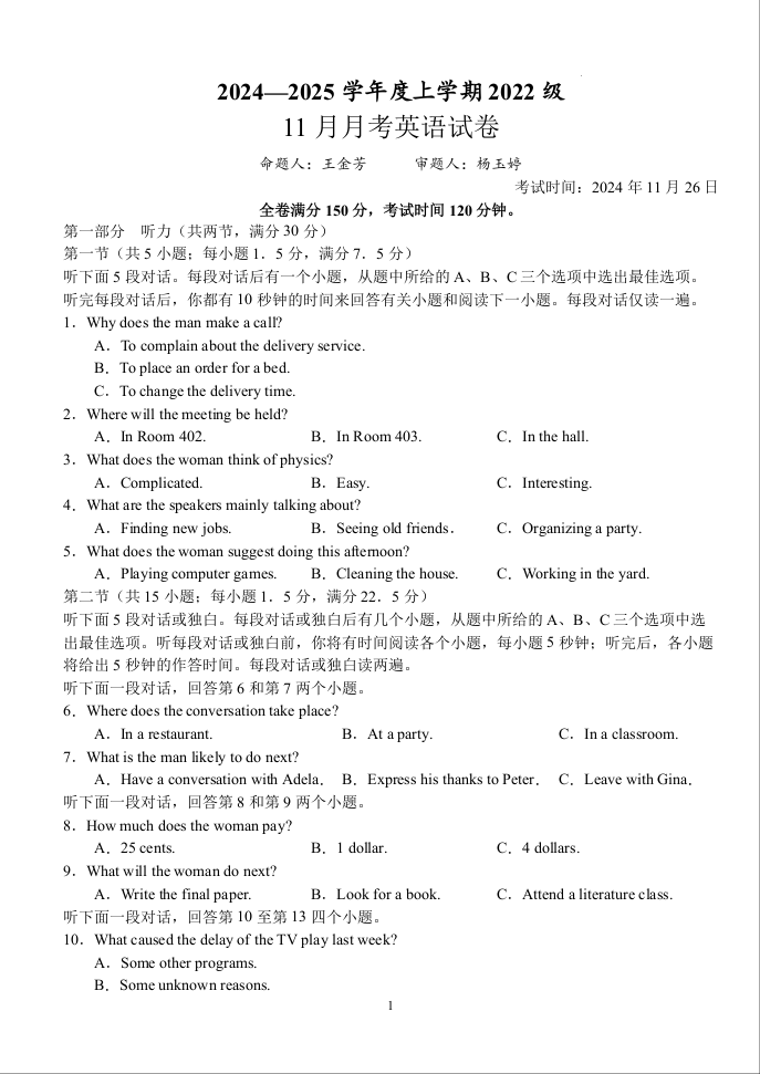 湖北省荆州沙市中学2025届高三上学期11月月考 英语