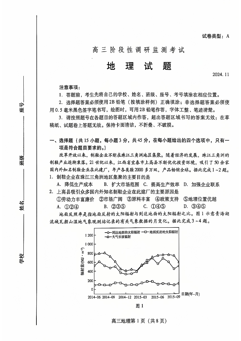 山东省潍坊市2025届高三上学期阶段性调研监测考试 地理