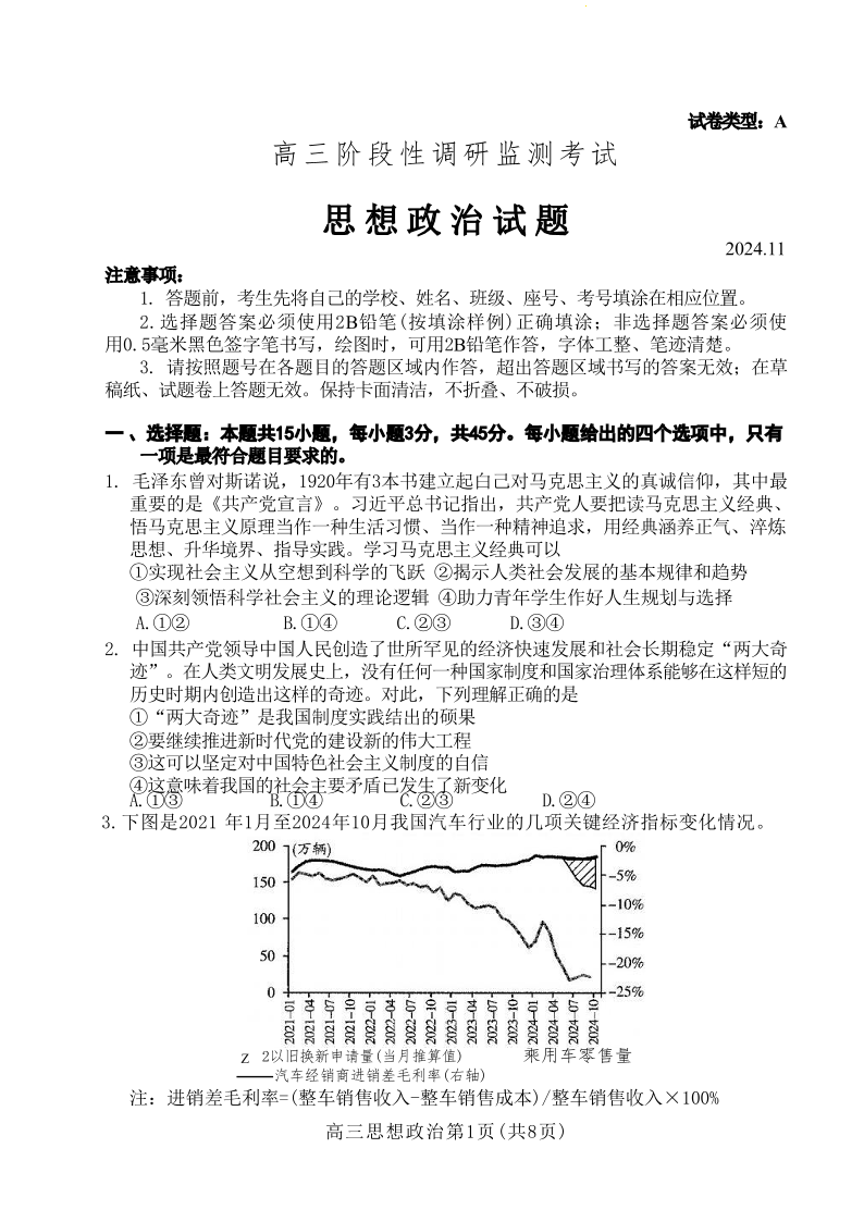 山东省潍坊市2025届高三上学期阶段性调研监测考试 政治