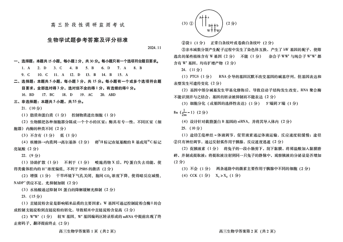 山东省潍坊市2025届高三上学期阶段性调研监测考试 生物答案