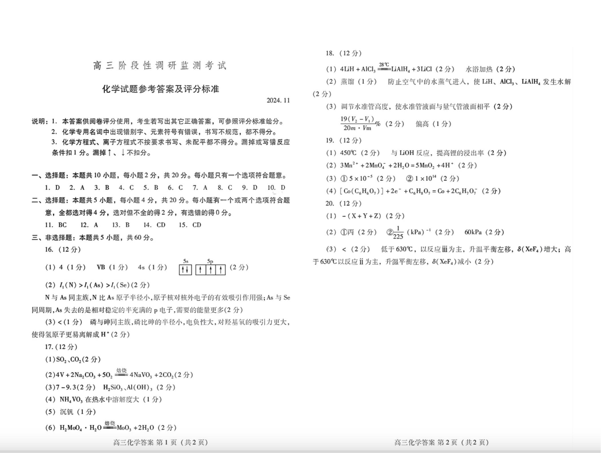 山东省潍坊市2025届高三上学期阶段性调研监测考试 化学答案